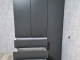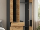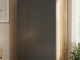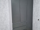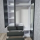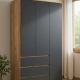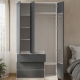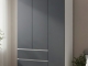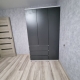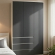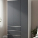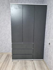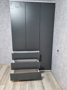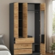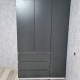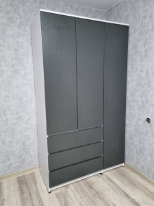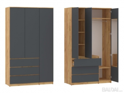 Trijų durų spinta su veidrodžiu ir stalčiais.